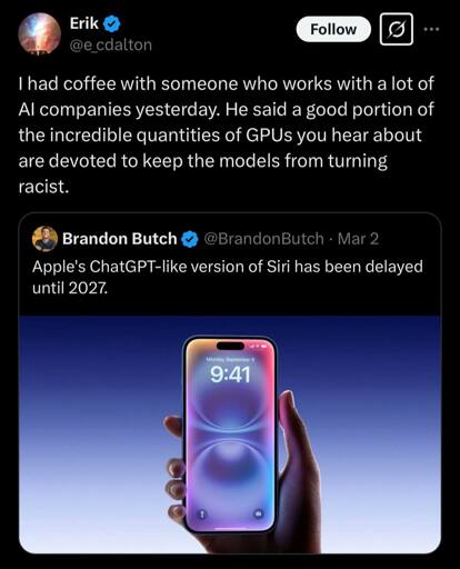 yarr@feddit.nlMEnglish · 10 months agoA good portion of the incredible quantities of GPUs you hear about are devoted to keep the models from turning racistplus-squarefeddit.nlimagemessage-square12linkfedilinkarrow-up154arrow-down15