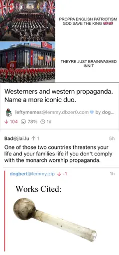 arrow-up12arrow-down1message-squareTankies: "western countries fawning over politicians is disgusting" also tankies: "omg kim jong-un is so relatable, so impressive, so much love"plus-square_cryptagion [he/him]@anarchist.nexusMEnglish · edit-26 months agomessage-square0linkfedilink