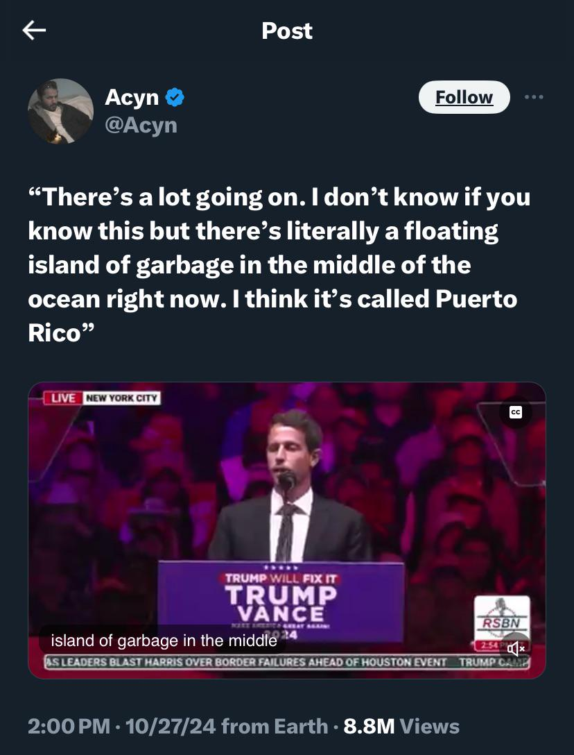 usernamesAreTricky@lemmy.ml to People Twitter@sh.itjust.works · 1 year agoThe Great Republican Political Strategy of Insult Puerto Rico for Some Reasonlemmy.mlimagemessage-square183linkfedilinkarrow-up1848arrow-down110