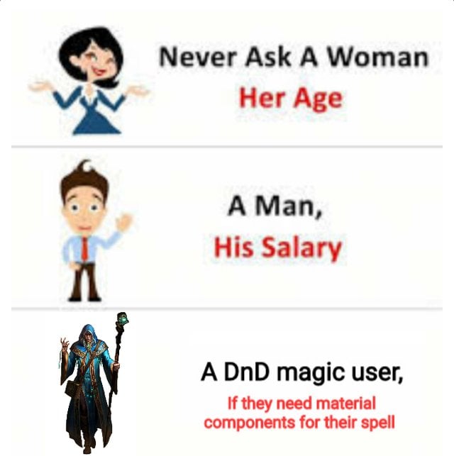 minus-squareThe Ramen Dutchmanlinkfedilinkarrow-up2·1 year agoOr an arcane focus. Or their wizard spell book. It’s not that hard, unless the component costs significant money.