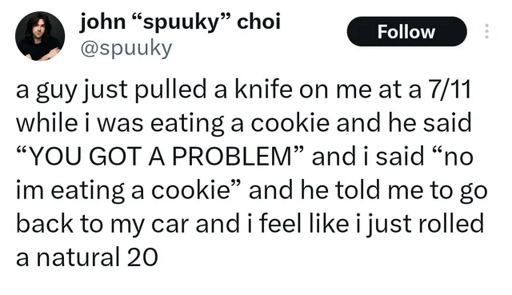 I have a hard time telling what this person rolled in the knife situation. Awareness may have been like a 2. Intimidation could have either been a 2 or a 19. I mean the person had 0 idea why they had a knife, nor was considered a threat to let them leave first… or after. For all we know dude robbed the whole store, asked everyone if they had a problem staying silent and dudes just fucking munching out on a cookie. If they switch to doughnuts they could have been a 90s cop.