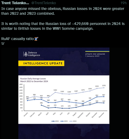 As I’ve suggested for awhile, there is a worsening of the Russian KIA vs. WIA ratio, due to a lack & systemic breakdown of medical evac, the people and armored vehicles required to do it, wounded not being sent to hospitals, as they go AWOL, used instead in wave assaults, increasing drones w/ multiple strikes on target, etc.