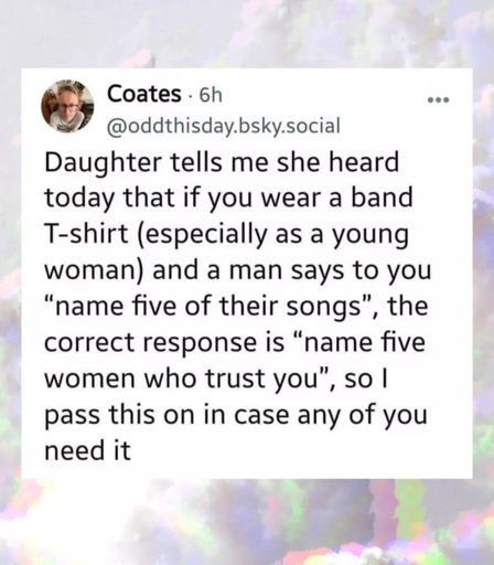 I (~40 year old dude) had a similar thought when I saw this post. I like spaceslug a lot (and I’m wearing one of their tshirts right now!) but I don’t really know individual songs. Lemanis is a great album and Memorial has some good tracks, but names? Uhhh