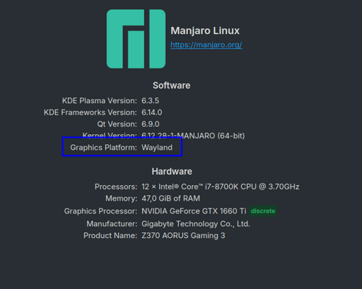 Hello there! I was using Wayland for quite a while and things are more or less smooth (NVIDIA proprietary driver). I think it’s time for Manjaro to move to Wayland by default for both Plasma session and SDDM. Here’s small FAQ regarding the change: Q: How can I check if I’m using Wayland? A: Check About this System in System Settings. Q: How could I try Wayland? A: Log out from your session and select a Plasma (Wayland) desktop session for the next log in. Q: What hardware is supported? ...
