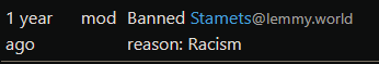 A friend was wondering why they hadn’t seen my posts and figured I’d been banned from lemmy.world or just left in general. I went to his instance and saw that in the modlog.