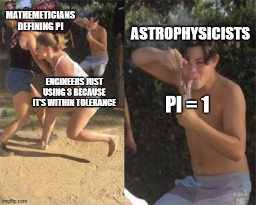 The man smoking is labeled “astrophysicists” and the pipe is labeled “pi = 1”