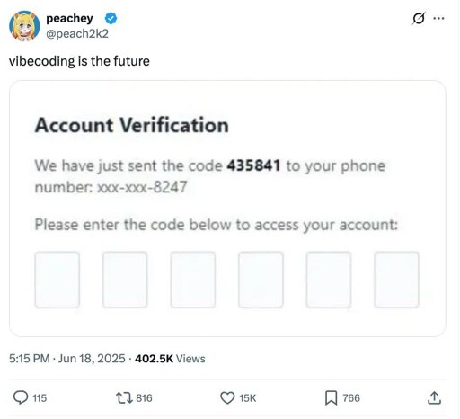 arrow-up11.29Karrow-down1imageVibecoding is the futurelemmy.mlcm0002@sh.itjust.works to Programmer Humor@programming.dev · 4 months agomessage-square82linkfedilinkcross-posted to: fuck_ai@lemmy.worldprogrammerhumor@lemmy.ml