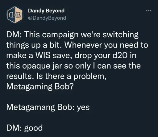 Like, I also don’t really enjoy a nameless kobold killing Finnigan the Fighter with a fluke natural 20 in what wasn’t supposed to be high stakes. But the solution for me isn’t to fudge rolls, but play a different game. I don’t really like stupid deaths like that, so I don’t play games that facilitate it. I know that’s kind of “baby with the bathwater” for some people, but I really do think some people are fighting against what D&D trends towards, when there are better tools. It’s a hammer. Sometimes you want a screwdriver or a pen.
