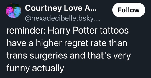 reminder: Harry Potter tattoos have a higher regret rate than trans surgeries and that’s very funny actually