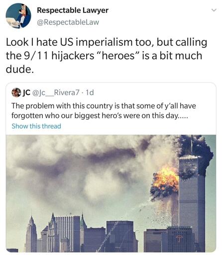 9/11 has nothing to do with the US overthrow of foreign governments. The US didn’t make bin Laden into what he became, bin Laden did. The guy was an egomaniac bedazzled by his own bullshit. The notion that the attacks were reeeaaally about oil access or regime change or economic disparity as opposed to bloodyminded religious zealotry is a lie.