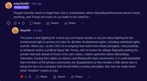Onyx376@lemmy.ml to Privacy@lemmy.ml · edit-21 year agoFlirting with Trump is flirting with Nazism - Response to Andy Yen (CEO of Proton AG) on Reddit 📢📢📢lemmy.mlimagemessage-square325linkfedilinkarrow-up11.08Karrow-down196file-textcross-posted to: privacy@lemmy.dbzer0.com