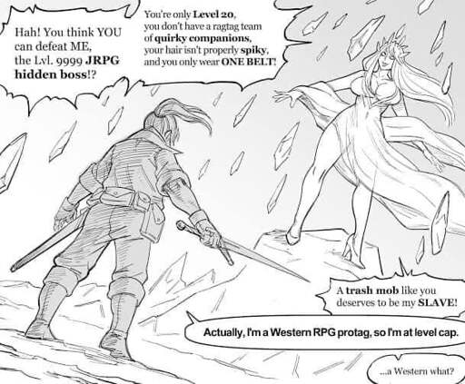 That said, for the joke, Asian games tend to use a greater number of levels, either with smaller increases in power or they just don’t cap anything and let the numbers get bigger and bigger with little or no functional difference as long as you’re fighting things scaled to your level. A little stat boost every level then a special power after ten can be the same as one level where you get all that without the other nine congratulatory dings that don’t really mean much.