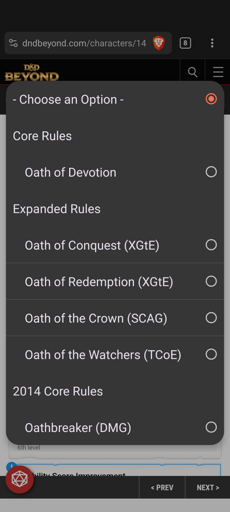 I am trying to make a 2024 version of my paladin. I can pick Oath of Devotion because it is free. I can pick the Xanathar’s options and Oathebreaker because they are from 2014 content I own, but I cannot pick the 2014 version of things I own if they’re in 2024 content I don’t own. I can’t use the Oath of the Ancients.