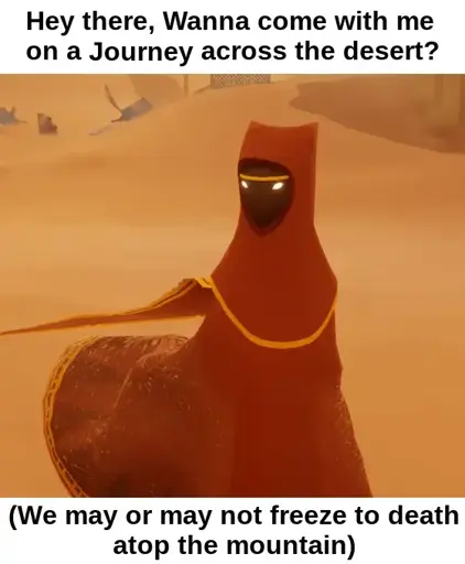 If you haven’t already, when you’re done, you should give Sky: Children of Light a go, it’s the next game that dev team made, and it’s great (if occasionally frustrating due to bugs that stem from the CEO being a greedy bastard, but the game itself is still beautiful, the devs are definitely trying their hardest, and they’re getting better at at least compensating players when it gets too buggy). They even have a Journey outfit that gives you a special calling voice! (though it is an IAP 😭)