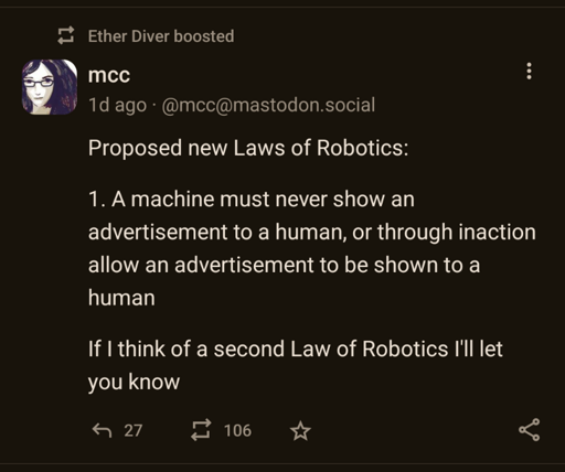 I’d argue that advertisements fall under “A robot may not injure a human being or, through inaction, allow a human being to come to harm.”