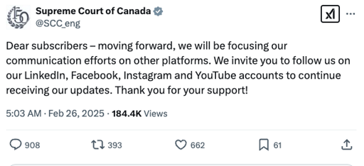 This is a letter I sent to the Supreme Court of Canada upon hearing this morning that they had announced their departure from the Twitter/X platform. CC: Speaker Greg Fergus, House Clerk Janse, Senate Clerk Greffiere, Senator Paula Simons, MP Gord Johns Dear Right Honourable Chief Justice Wagner, Honourable Justices, Supreme Court Officials and Staff, … Continue reading "The Supreme Court of Canada Leaves Twitter — It’s time all Canadian entities use Canadian Social Media"