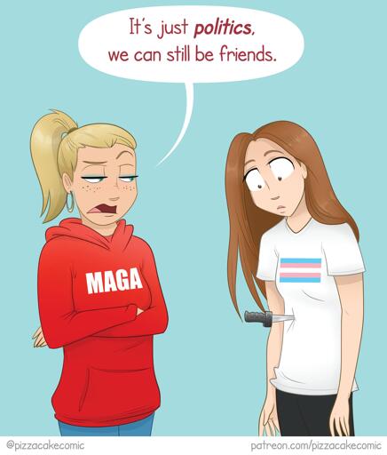 BUT, I agree 100%. If your politics are deliberately harmful to marginalized groups, it’s pretty fucked up to make the argument that “it’s just politics”.