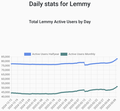 arrow-up12.49Karrow-down1imageThere's a clear up tick on daily users growing and we've crossed the 50k line as of yesterday! LETSSS GOOO!locklemmy.worldcm0002@lemmy.world to Fediverse@lemmy.worldEnglish · 11 months agomessage-square622linkfedilink