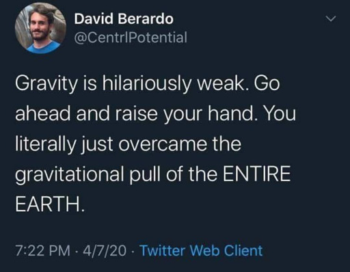minus-squareNaz@sh.itjust.workslinkfedilinkEnglisharrow-up18·9 months agoAnd now jump in the air and escape the gravitational pull. 12 kilometers straight up. 150 km. Gravity not so weak now, huh?