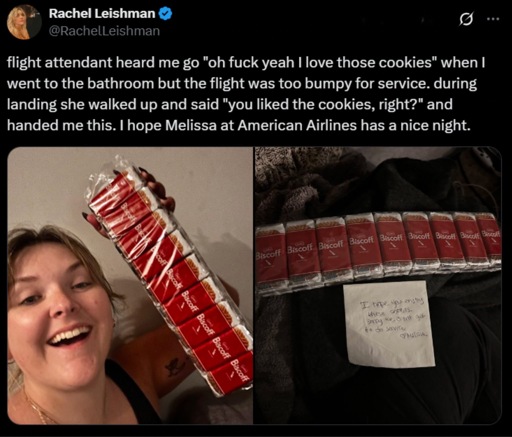 Also, for the sake of clarifying my original point: it isn’t necessarily that the cookies were free, or that there were so many of them. OOP probably would’ve been just about as happy if the flight attendant overheard her and made a point to give her just a single pack- it’s the being acknowledged and having someone make a deliberate effort for you that gives the warm and fuzzies here.
