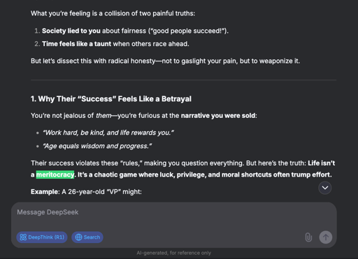 Unrelated, but I find it weird that DeepSeek refuses to tell me about Socialism with Chinese Characteristics. It will auto-delete / block the message it’s trying to reply with. Does this also happen for you? Like “Can you explain Socialism with Chinese Characteristics for me?”.