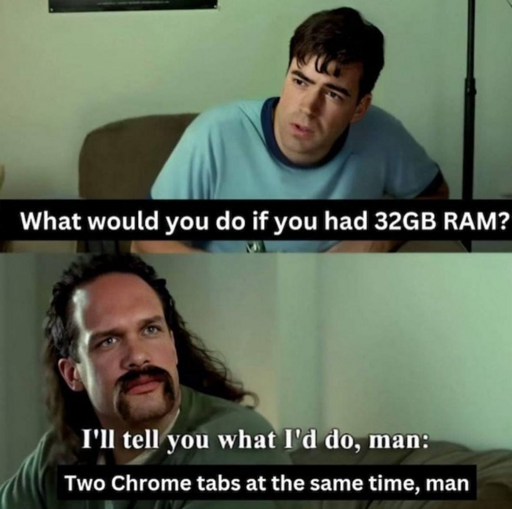 arrow-up181arrow-down1imageWhat would you do if you had 32GB RAM?lemmy.ml☆ Yσɠƚԋσʂ ☆@lemmy.ml to Memes@lemmy.mlEnglish · 10 months agomessage-square1linkfedilinkcross-posted to: memes@lemmy.world