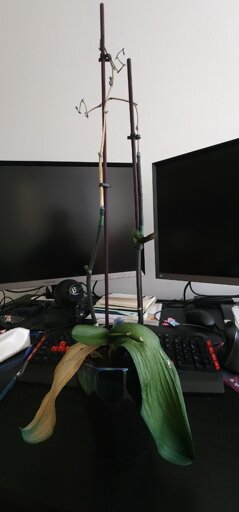 A maybe dead orchid. Half the stems are green. Some of the leaves are dark green. We’re aren’t sure if we can save her but we don’t want to throw her out, if there’s a chance. Any help appreciated!