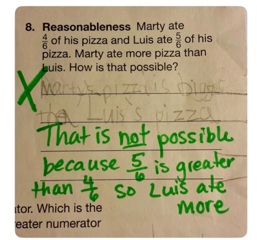 No. The teacher did not have it wrong. Does not mean the student is right … Marty and Luis both had their own pizza. Marty had a big pizza and “only” managed to eat 4/6th of it. Luis had a small pizza, and “only” managed to eat 5/6th of his.