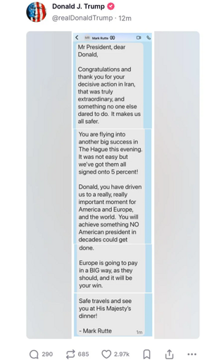 It’s clear Mark Rutte is talking to Trump like he’s talking to a child. He’s buttering Trump up because it’s clear superficial gestures are enough to please him.