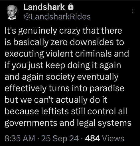 When the definition of “violence” could mean anything from an armed robbery to throwing your phone on the ground or raising your voice, this is pretty clearly just a “Kill all the [x] people” fantasy. Guarantee this guy isn’t expecting most of the executions to be white men.