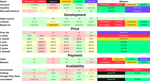 - The very left column is the category for each row, the middle section is the various VPN providers, and the right section is which VPNs are the best in each category.