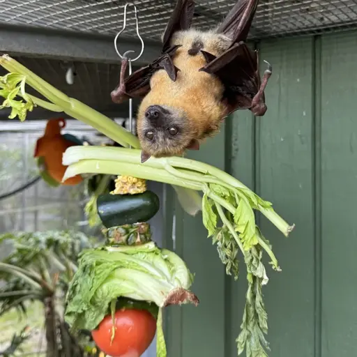 A picture of a golden-mantled flying fox hanging upside down. Behind it is a vegetable and fruit “kabob” with celery, zucchini, pineapple, lettuce, and tomato.