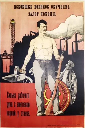 “Military training for all people is the pledge of victory. A strong working hand with a rifle by the machine.”