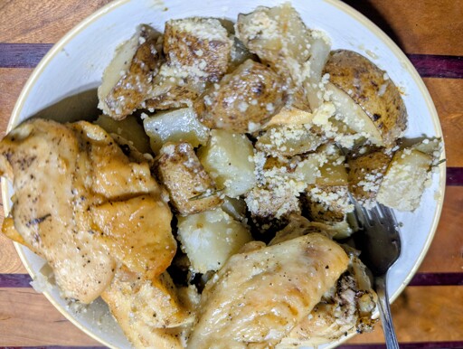 This Italian classic is chicken, potatoes, olive oil, garlic, salt, pepper, a few sprigs of fresh rosemary from the yard and some parmesan.