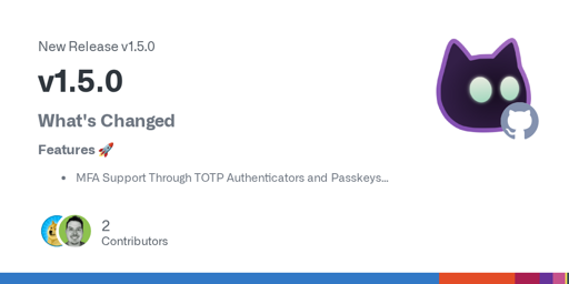 This release includes Multi-Factor Authentication (MFA) Support through TOTP Authenticators! There are other features in this release, like a migration from pug to ejs for email notification templates and quality of life improvements like a built-in container healthcheck, navigation between some admin pages, and reducing the character minimum for usernames to just three letters (sorry ted); but MFA is the big one! Users can enable MFA on their accounts to require an Authenticator or Passkey during sign in, and admins can add MFA requirements to groups, OIDC Clients, and ProxyAuth Domains to require users to setup and use MFA in specific scenarios.
