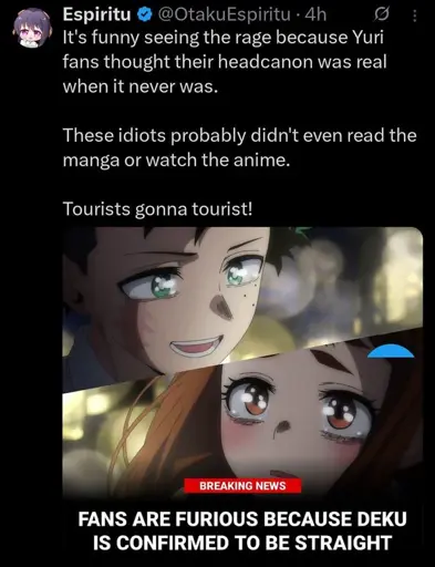 Yuritopiaposadism [none/use name]@hexbear.net to Slop.@hexbear.netEnglish · 20 days agoGuy is straight, this upsets Yaoi fans, twitter insults Yuri. This is why we call you tourists.hexbear.netimagemessage-square29linkfedilinkarrow-up158arrow-down11