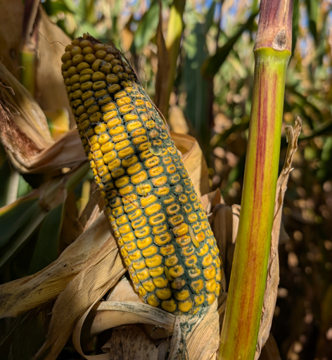This here is trichoderma ear rot in an organic field. This 100 day variety was chewed on by an earworm. The damaged kernals allowed trichderma to enter and infect the ear. This ear rot produces many toxins and is a big no for consumption.