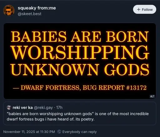Dwarf Fortress bug reports are incredible. Since this is lemmy I’m sure people have heard of the alcoholic cats but it’s a fun reread