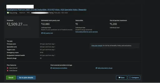 The most expensive plan on my state’s marketplace. Honestly, I’m going to have to start selling myself, or my body parts, to be able to afford this shit.