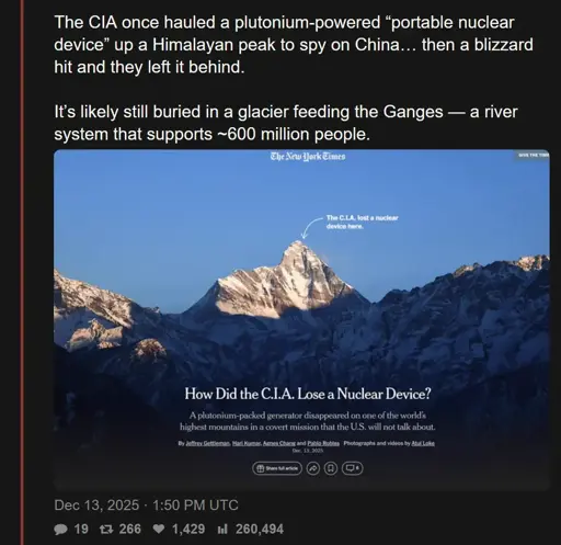 Plutonium device lost at a glacier feeding the Ganges river system, feeding 600 million people.