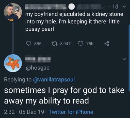 They said they’d prefer to live in a world where this didn’t get posted (no mention of the past). You then bring up the idea that people in the past were less perverted wasn’t a thing. But they didn’t talk about some mythological past, they were talking about the point in history when OP decided to post this. If OP hadn’t posted this, we wouldn’t’ve have to read it.