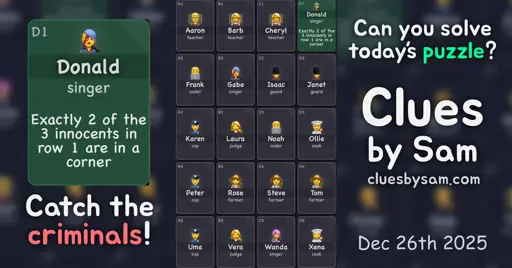 arrow-up116arrow-down1external-linkClues by Sam 2025--12-24cluesbysam.comSorryImLate@piefed.social to dailygames@lemmy.zipEnglish · 5 days agomessage-square10linkfedilinkfile-textcross-posted to: dailygames@lemmy.zipdailygames@lemmy.zipdailygames@lemmy.zipdailygames@lemmy.zipdailygames@lemmy.zipdailygames@lemmy.zipdailygames@lemmy.zipdailygames@lemmy.zipdailygames@lemmy.zip