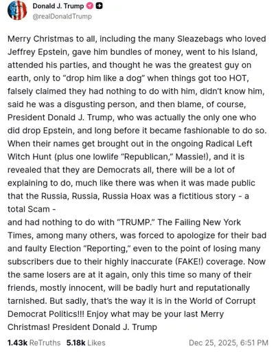 arrow-up192arrow-down1imagenew Trump post about Epstein on Christmashexbear.netdead [he/him]@hexbear.net to Chapotraphouse@hexbear.netEnglish · 3 天前message-square19linkfedilinkfile-text