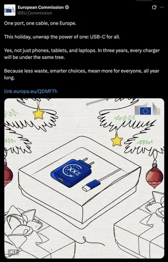 I really don’t think Yog has anything against USB-C standardization. We all think it’s a good thing, or so I would think. But this specific wording, “One x. One y. One z.” is not that common and exactly like one of the most common Nazi slogans, and it’s the EU Commission saying it. It’s just a silly shitpost, I think.