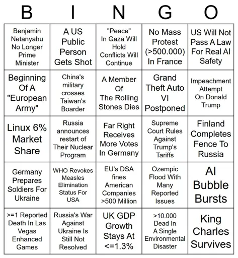 I recently saw someone creating a bingo chart for 2025 so I decided to create one for 2026 (image of this post). What are your predictions for 2026?