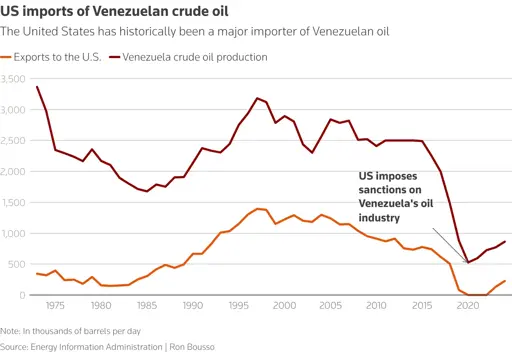 arrow-up11arrow-down1imagePresident Trump expects American oil companies to invest heavily in Venezuela's broken petro-sector, but U.S. oil companies may be hesitant to do sowww.reuters.comnoumenon@lemmy.world to Business@lemmy.worldEnglish · edit-22 days agomessage-square2linkfedilinkcross-posted to: dataisbeautiful@lemmy.world