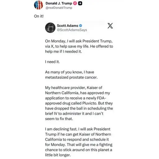 After Trump’s intervention, Adams joked that “nobody in senior management at Kaiser, my health care company, had a good weekend.” He added: “I feel bad about it, but good about it — because it might have saved my life. I mean, there’s a very good chance.”