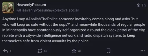 In another reply I emphasized the importance of collaborative efforts but I didn’t know how to put into words what you’ve brought up. Anarchism is life-giving. We keep us safe, and you will never feel as safe as when you are working together to keep your neighbors safe, and seeing them work to keep you safe.