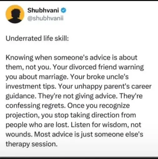 The way I heard it, and it changed my life, was “All advice is autobiographical.” You have to filter it through your opinion of the person, how self aware they are, and how much you think they’re sincerely trying to think of you when giving advice.