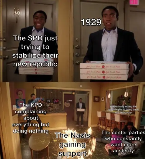 It’s a meme about smol bean SPD who just happened to end up in a bad situation through no fault of their own, just like the Democratic party.